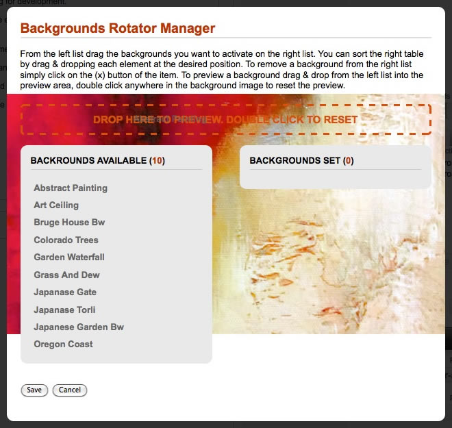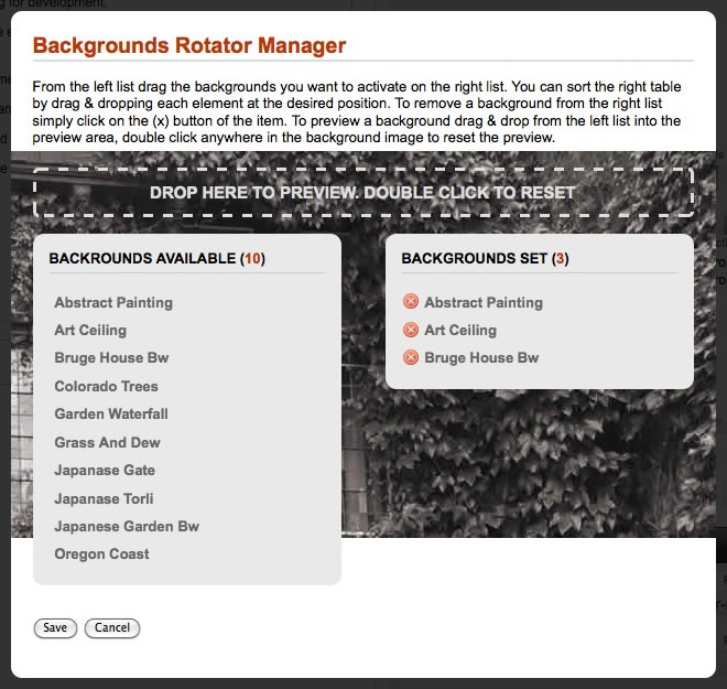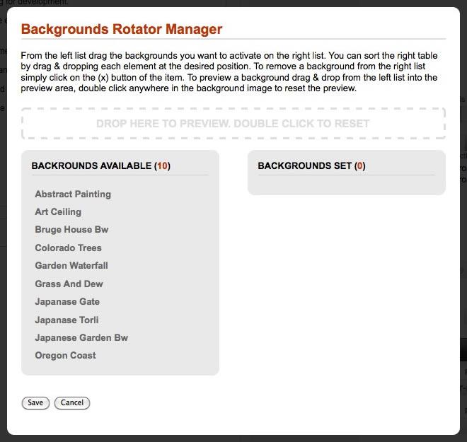 The Background Rotator Manager is the administrator based control which determines which background images appear in the rotator. Simply go to Admin → Template Manager → rt_panacea_j15 → Settings → Rotator and select the Manage button to load the Background Rotator Manager. The manager operates as follows: