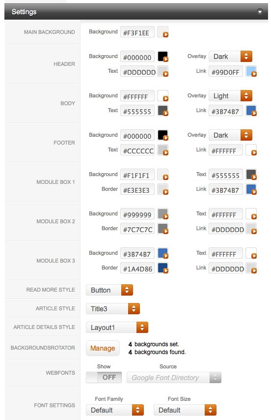 Theses settings are not directly affiliated with the Color Chooser portion, but affect the template styling nevertheless.